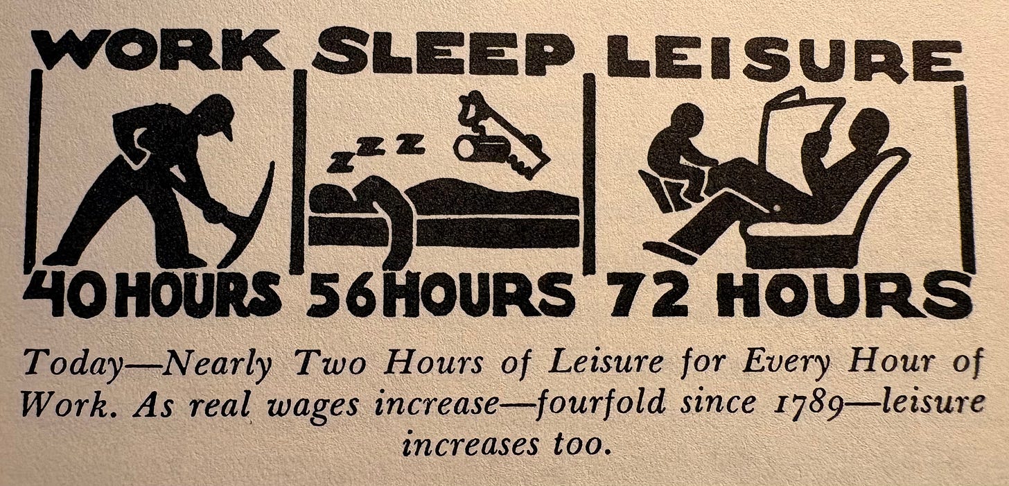 I spotted it in a book called Science for the World of Tomorrow, written by Gerald Wendt, the Director of Science for the 1939 New York World’s Fair. That’s the world’s fair whose theme was “the world of tomorrow.” It featured all sorts of exhibits about the gee-whiz world of jetpacks to come. And that’s the theme of Wendt’s book: Science produces technology; technology produces prosperity; as time and science advance, people inevitably become more prosperous. And work fewer hours.